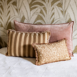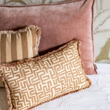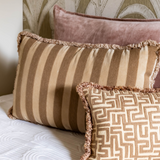– Bold Beige Print (30 x 50 cm): een compact rechthoekig kussen met subtiele print en franjes