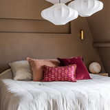 Samen vormen ze een harmonieus geheel: het roze kussen fungeert als zachte basis, het mauve-kussen voegt nuance, en het butterflyprintkussen brengt beweging en finesse.