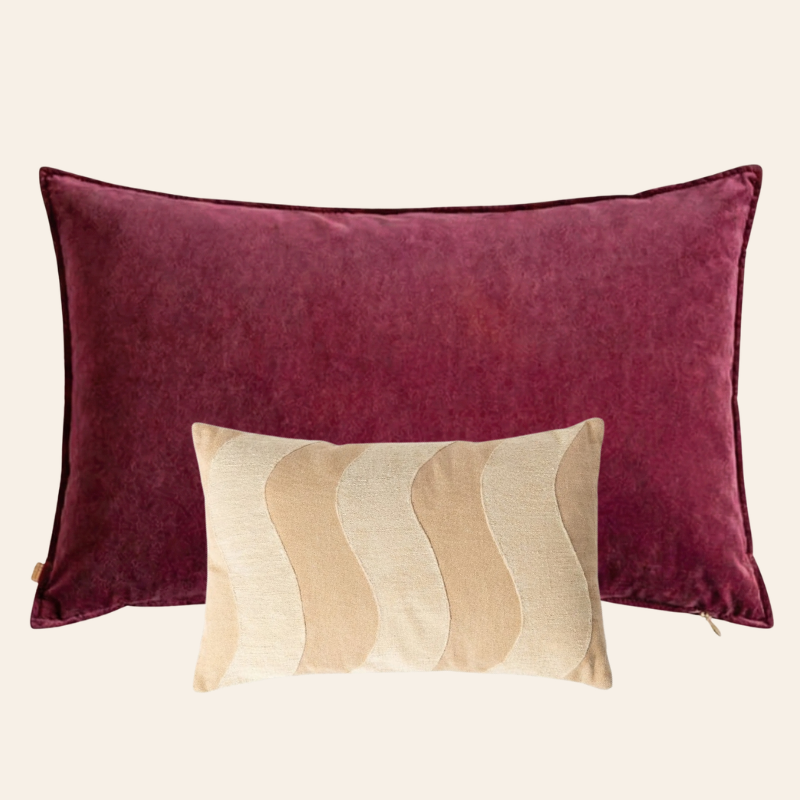 Das Claire-Set kombiniert das XL-Kissen in Magical Mauve (50 x 90 cm) mit dem 30 x 50 cm großen beigefarbenen Kissen mit vertikalem Wellenmuster und Fransen. Der tiefe Mauveton bildet eine beruhigende Basis, während das beigefarbene Kissen mit seinem Muster und seiner Struktur einen eleganten Akzent setzt.