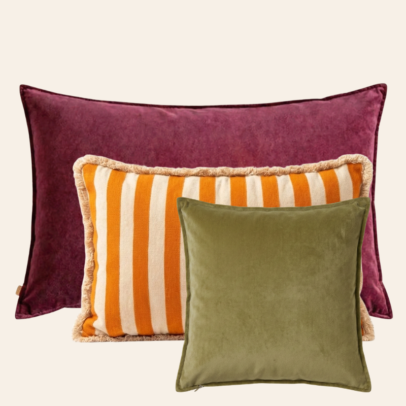 De Mara set combineert drie uitgesproken tinten in een gebalanceerde compositie. Het XL-kussen Magical Mauve (50 x 90 cm) vormt de diepe basis. Dit wordt aangevuld met het rechthoekige kussen Oatmeal Orange (40 x 60 cm) met strepen en franjes en het vierkante kussen Perfect Pistache (45 x 45 cm). Mauve, warm oranje en fris pistachegroen zorgen samen voor contrast en samenhang.