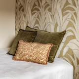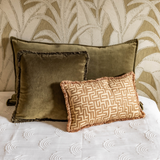 Grounded Green (40 x 60 cm) – rectangular cushion with olive green stripes and fringes, for a touch of texture and playfulness