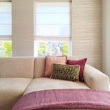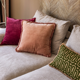 The strength of this set lies in the mix of colors and textures. The solid red-purple mauve cushion exudes tranquility and depth, while the pink cushion with fringes adds a soft, cheerful touch. The beige cushion with a subtle olive green print and fringes adds a natural detail that balances the set. Together, they create a playful yet refined look. These cushions can also be styled beautifully individually.