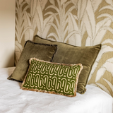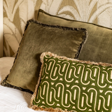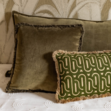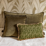 – Olive Oasis (30 x 50 cm): rectangular beige cushion with subtle olive green print and fringes