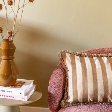 Dankzij de combinatie van zachte tinten, speelse franjes en verschillende formaten ontstaat er een gelaagde en uitnodigende sfeer. Ideaal voor wie houdt van naturel met een verfijnde twist. De set past bijvoorbeeld perfect op een lichtgrijze bank, groene fauteuil of beige bank.