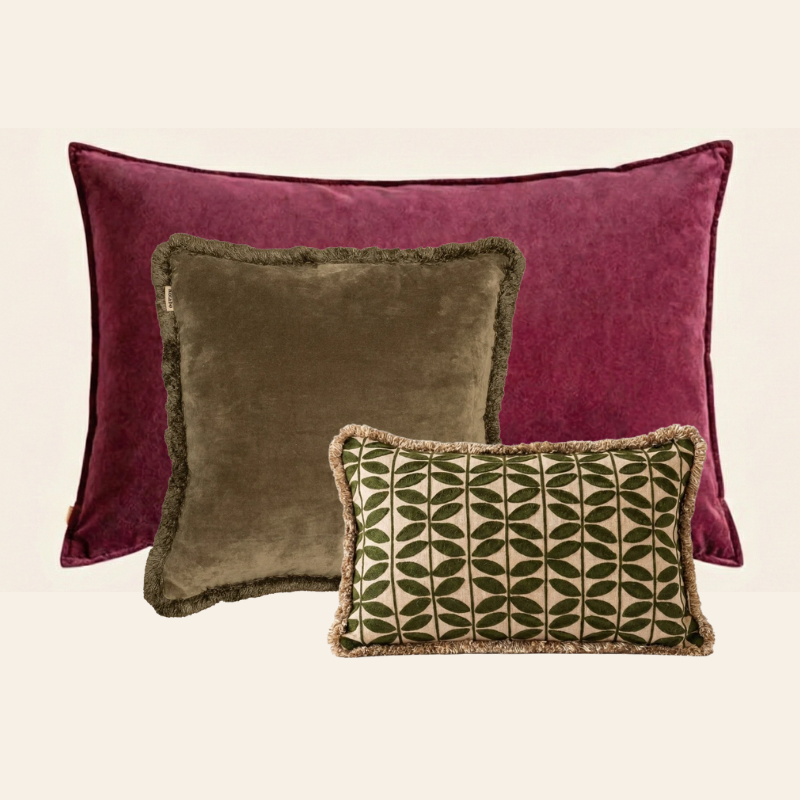 Magical Mauve brengt een volle, rijke ondertoon, terwijl Olive Oasis het geheel verzacht en aardt. De combinatie van effen stoffen en subtiele prints geeft variatie zonder onrust. Dankzij de mix van XL, vierkant en rechthoekig ontstaat een gelaagde styling die moeiteloos oogt. De zachte materialen en franjes voegen comfort en textuur toe en blijven mooi in gebruik.